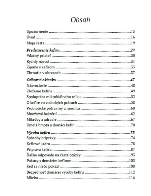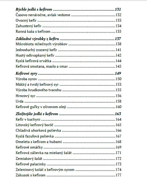 V knihe nechýba návod ako sa doma starať o svoj kefír, recepty, príbehy a skúsenosti, a tiež vysvetlenie liečivého pôsobenia tohto kyslomliečneho nápoja. Nájdete tam rad zaujímavých článkov o našich mikrobiálnych priateľoch, o plnohodnotnej výžive, o pravekom pôvode kefíru či dokonca o tajomstve nesmrteľnosti.