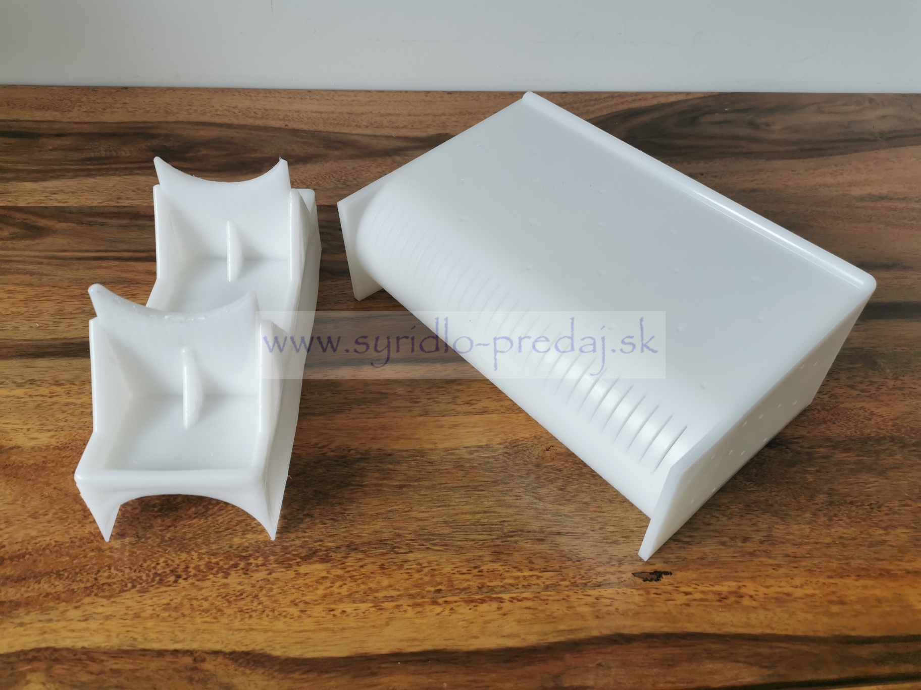 Odtokové otvory na spodnej časti formy účinne slúžia na oddelenie srvátky v procese tvarovania syra. Forma je vyrobená z pevného plastu.
